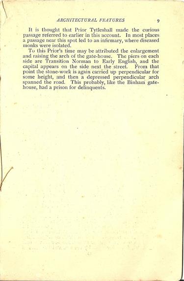 It is thought that Prior Tytleshall made the curious passage referred to earlier in this account. In most places a passage near this spot led to an infirmary, where diseased monks were isolated.