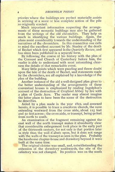 Another instance of the aid a well-designed plan gives to the better understanding of the arrangements of these conventual houses is emphasized by reading Ingulphus's account of the destruction of Croyland Abbey by fire with a plan of Castle Acre. The reader may almost imagine the latter place to have been the scene of the destruction he describes.