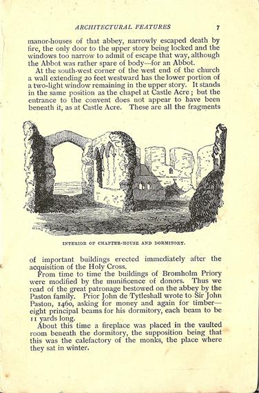 From time to time the buildings of Bromholm Priory were modified by the munificence of donors. Thus we read of the great patronage bestowed on the abbey by the Paston family. Prior John de Tytleshall wrote to Sir John Paston, 1460, asking for money and again for timber— eight principal beams for his dormitory, each beam to be 11 yards long.