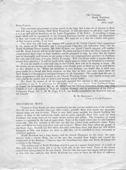 Souvenir programme from the "Sunday Half Hour Broadcast" on 4th July 1948 from St Nicholas' Church in North Walsham....