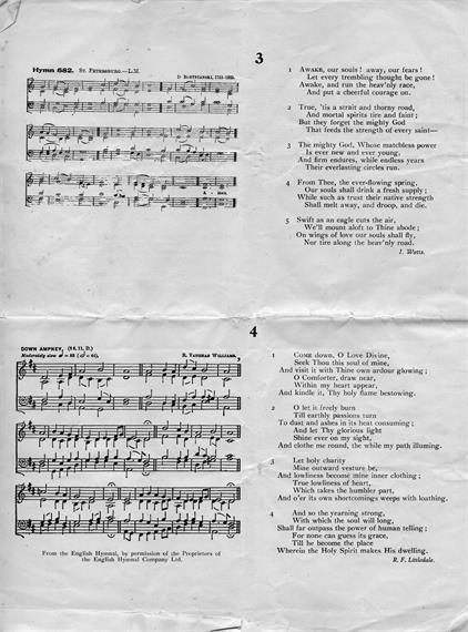 If you are unable to come and sing in the Church, then join us in singing at home. All the hymns we are having are worth singing, even though some of them are not so well known as they deserve to be. When the broadcast is over perhaps you might like to send your programme to a friend who lives overseas, so that they in their turn may listen when the Half Hour is re-broadcast to overseas listeners on 5th September. The profits from the sale of these programmes will be devoted to our Church Warming Fund. Our Church is large and very cold in the winter, and we need a new heating system badly.