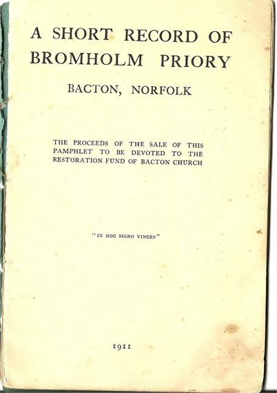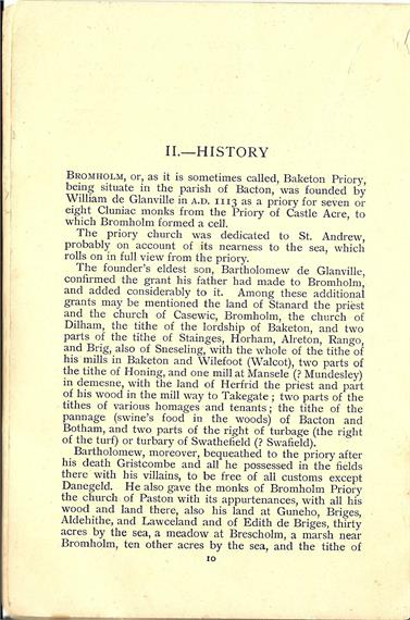 Bromholm, or, as it is sometimes called, Baketon Priory, being situate in the parish of Bacton, was founded by William de Glanville in a.d. 1113 as a priory for seven or eight Cluniac monks from the Priory of Castle Acre, to which Bromholm formed a cell.