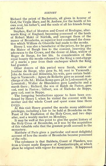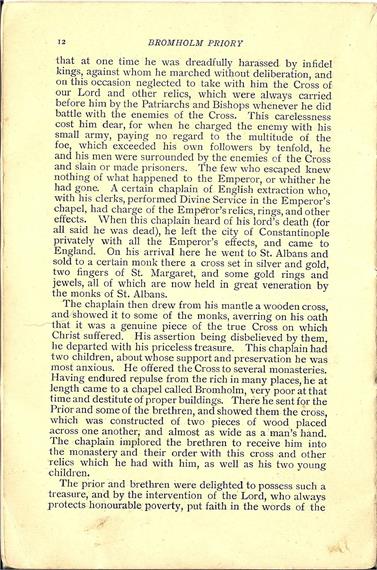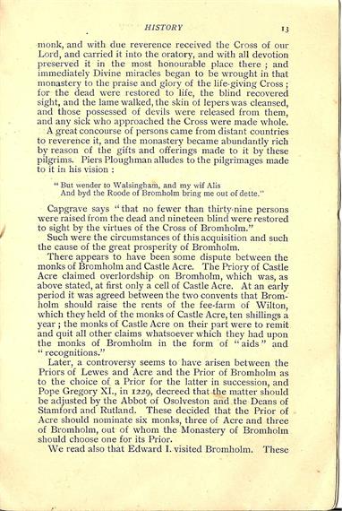 At this visit Henry granted the monks many additional privileges, including a fair to be held at Bromholm on the Feast of the Exaltation of the Holy Cross, and two days after, and a weekly market on Mondays. . It may be well at this point to give the quaint history of the Holy Cross of Bromholm, as it was by the acquisition of this valuable relic that the greatest profit accrued to the monastery.