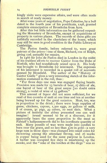 In 1466 Sir John de Paston died in London in the midst of his fruitless efforts to recover Caistor from the Duke of Norfolk, who had scandalously seized upon it. His body was brought to Bromholm for interment. The expenses of his interment is recorded in a quaint roll of accounts penned by Blomfield. The author of the " History of Caistor Castle " gives a very interesting sketch of the information contained in the roll, thus :