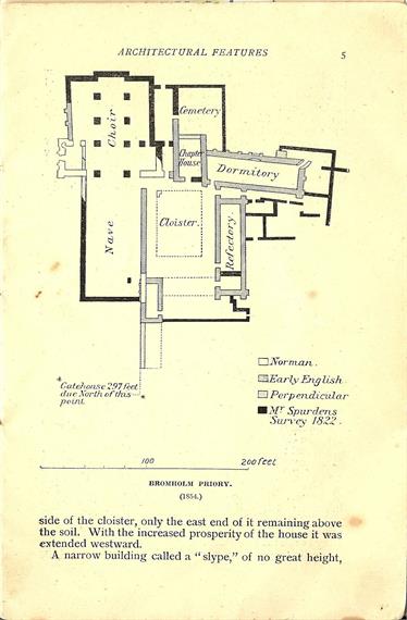 From time to time the buildings of Bromholm Priory were modified by the munificence of donors. Thus we read of the great patronage bestowed on the abbey by the Paston family. Prior John de Tytleshall wrote to Sir John Paston, 1460, asking for money and again for timber— eight principal beams for his dormitory, each beam to be 11 yards long.