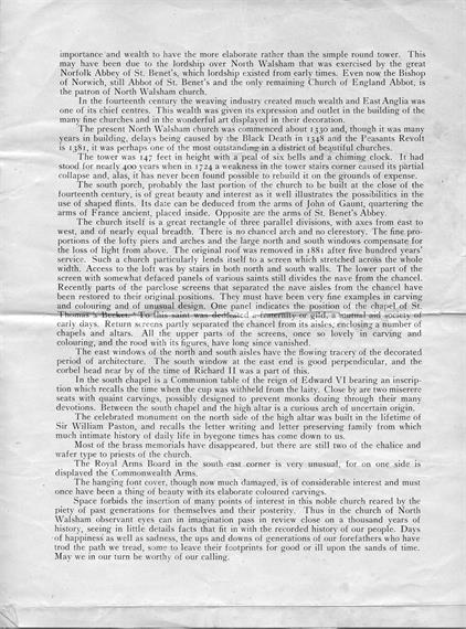 Space forbids the insertion of many points of interest in this noble church reared by the piety of past generations for themselves and their posterity. Thus in the church of North Walsham observant eyes can in imagination pass in review close on a thousand years of history, seeing in little details facts that fit in with the recorded history of our people. Days of happiness as well as sadness, the ups and downs of generations of our forefathers who have trod the path we tread, some to leave their footprints for good or ill upon the sands of time. May we in our turn be worthy of our calling.