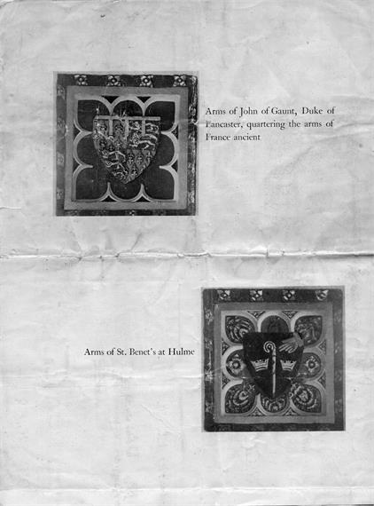 The south porch, probably the last portion of the church to be built at the close of the fourteenth century, is of great beauty and interest as it well illustrates the possibilities in the use of shaped flints. Its date can be deduced from the arms of John of Gaunt, quartering the arms of France ancient, placed inside. Opposite are the arms of St. Benet's Abbey.